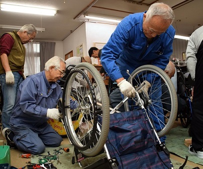 中古の車いすを新品同様に整備し、旅行者などの手荷物として発展途上国の障害者に届けるボランティア活動を続けています。設立から17年で、届けた先はアジアやアフリカなどの79か国、台数は約2500台にも上ります。1997年、現事務局長の吉田三千代さん(66)はバングラデシュのスラム街を訪れ、車いすが無く遠出が出来ない障害者が大勢いることを知りました。