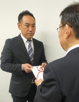 勝村孝行・同支部青年部会連合会長=写真左=が「被災者のために有意義に使って下さい」と事業団大阪支部の室田勝支部長代理に目録を手渡しました。